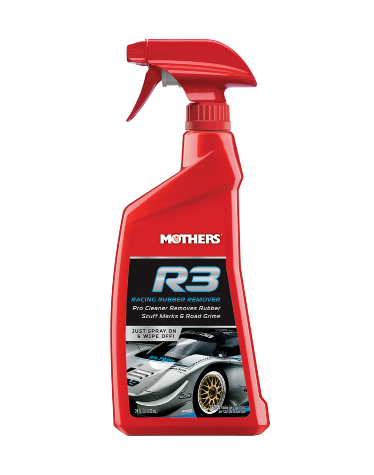 Mothers® R3 - Racing Rubber Remover is a spray-on, wipe-off cleaner, formulated to quickly and safely remove rubber scuff marks, dirt, soil and grime from paint, glass, vinyl wrap and just about any other exterior surface. Modern chemistry ensures that R3 is tough on tenacious rubber and grime, but gentle and safe for surrounding surfaces.